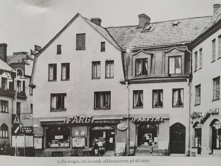 Sigges tobak till höger! Lilla torget, ett levande affärscentrum på 60-talet! Sigges torg i Midsommarkransen. Allt fanns i tobaksaffären till höger. Gubben var snål och man kunde inte ”snatta” där. Till höger utanför bilden fanns en ”mangel” där man kunde mangla lakan och i det huset bodde ”Bullen” som var en bussig kompis. Där bodde en tjock tant som inte kunde komma åt hårdmackorna, som man tryckte fast på ryggen. Hon var så tjock, så att hon inte kom in i bussen! Har för mig att det var bullens morsa! Bullen kanske lever än! Färgaffären på bilden var tråkigt värre! Mitt på torget fanns en liten korvkiosk som ”busgrabbarna” tippade omkull! Det var nog inte roligt att komma till korvkiosken, som låg ned när han skulle sälja korv! Ha ha ha! Utanför bilden fanns mjölkaffär, grönsaksaffär, frisör m.m. Mjölkaffären sålde typ bara mjölk och grädde! Skummjölk och typ V-mjölk och naturligtvis vanlig mjölk! Jag gick hos en av frisörerna som lite parvel och fick sitta på en bräda på armstöden för att komma upp i ”saxhöjd”