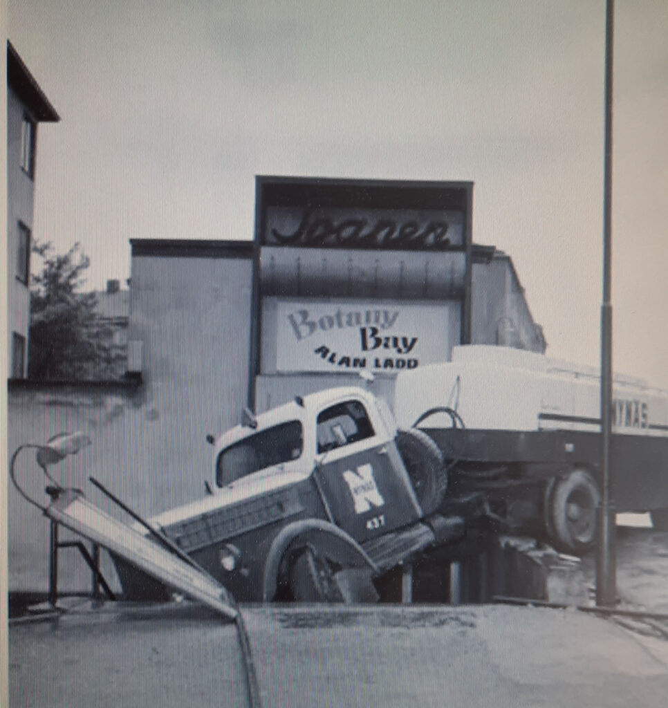 En tankbil har i maj 1953 rullat av vägen utför trappan mot biografen Svanen. Filmen som är aktuell på bion är Botany Bay med Alan Ladd. Den filmen var nog barnförbjuden som kvällsbio!